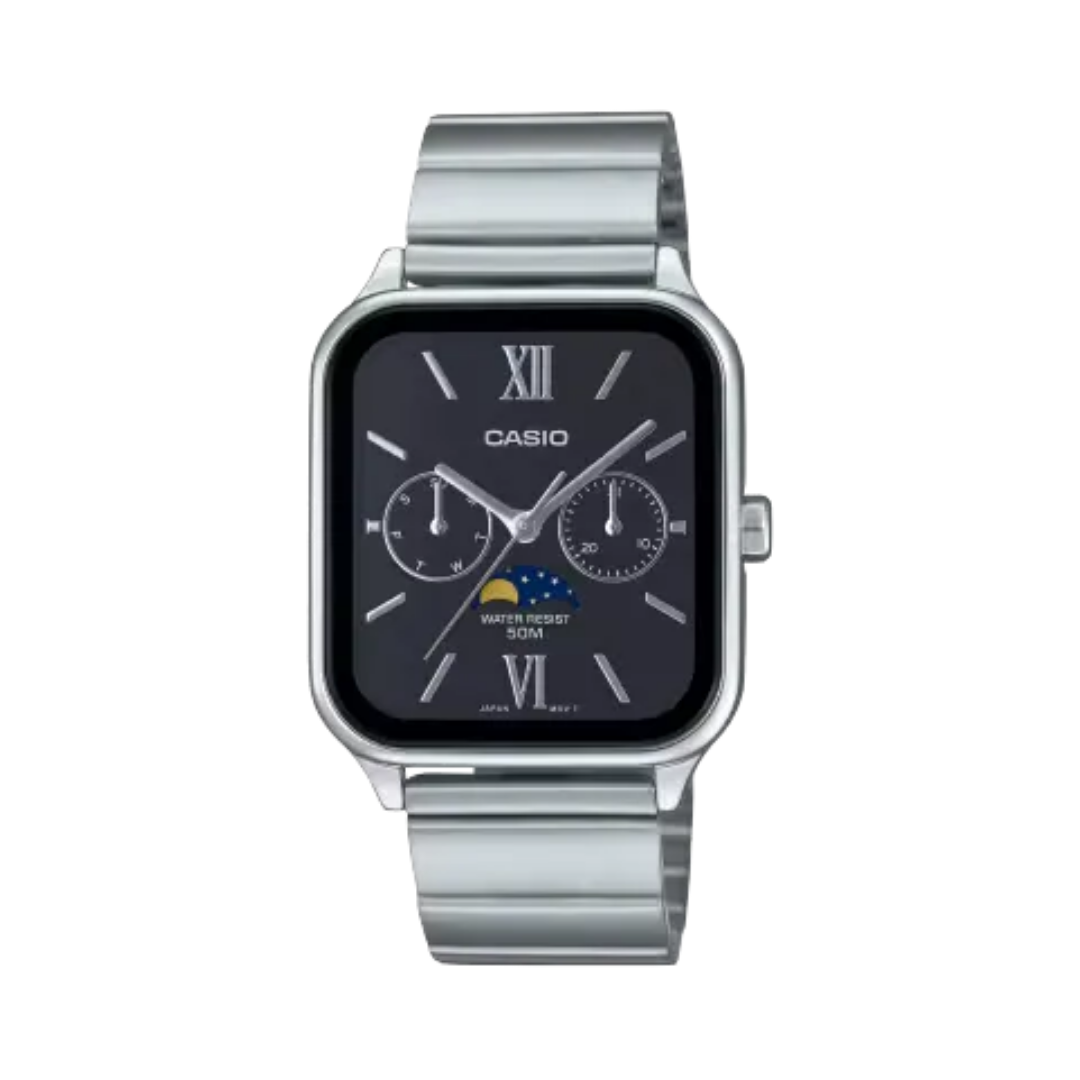 Casio MTP-M305 serisi, günlük yaşamlarına zarafet katmak isteyenler için mükemmel bir saat. Dikkat çeken özelliği, saat 6 konumunda bulunan ve ayın evrelerini romantik bir şekilde gösteren ay evresi mekanizması. Bu mekanizma, her biri üstte ve altta ayı gösteren iki diski 59 günde bir döndüren benzersiz bir teknoloji kullanıyor ve diskin üst yarısını ortaya çıkararak ay evresini gösteriyor. Yaklaşık 29,53 günlük ay yörünge periyoduna dayanan bu mekanizma, saat yapımcılığının doruk noktasını temsil ediyor ve hatayı en aza indiriyor. Bir zamanlar denizciler tarafından gelgitleri belirlemek için kullanılan ay evresi mekanizması, artık saat kadranını süsleyen güzel bir dekoratif unsur. Şık dikdörtgen kasa, akıllı saatleri anımsatan modern bir tasarıma sahip ve ona kentsel bir hava katıyor. Akordeon tarzı paslanmaz çelik kayış, modern döneme retro bir çekicilik katarken her kıyafete sofistike bir vurgu katıyor.